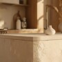 The kitchen counters were crafted in an L-shape and finished with tadelakt, an ancient Moroccan plaster known for its waterproof qualities and smooth, organic texture. Although tadelakt can be a challenging material to work with, it perfectly embodied the natural, molded look the designers envisioned. Open shelves and cabinetry fronts made from reclaimed antique wood add warmth and character, sourced from a renowned antiques fair in Texas that attracts vendors from around the world. This careful curation of materials imbues the space with a rich sense of history and craftsmanship.